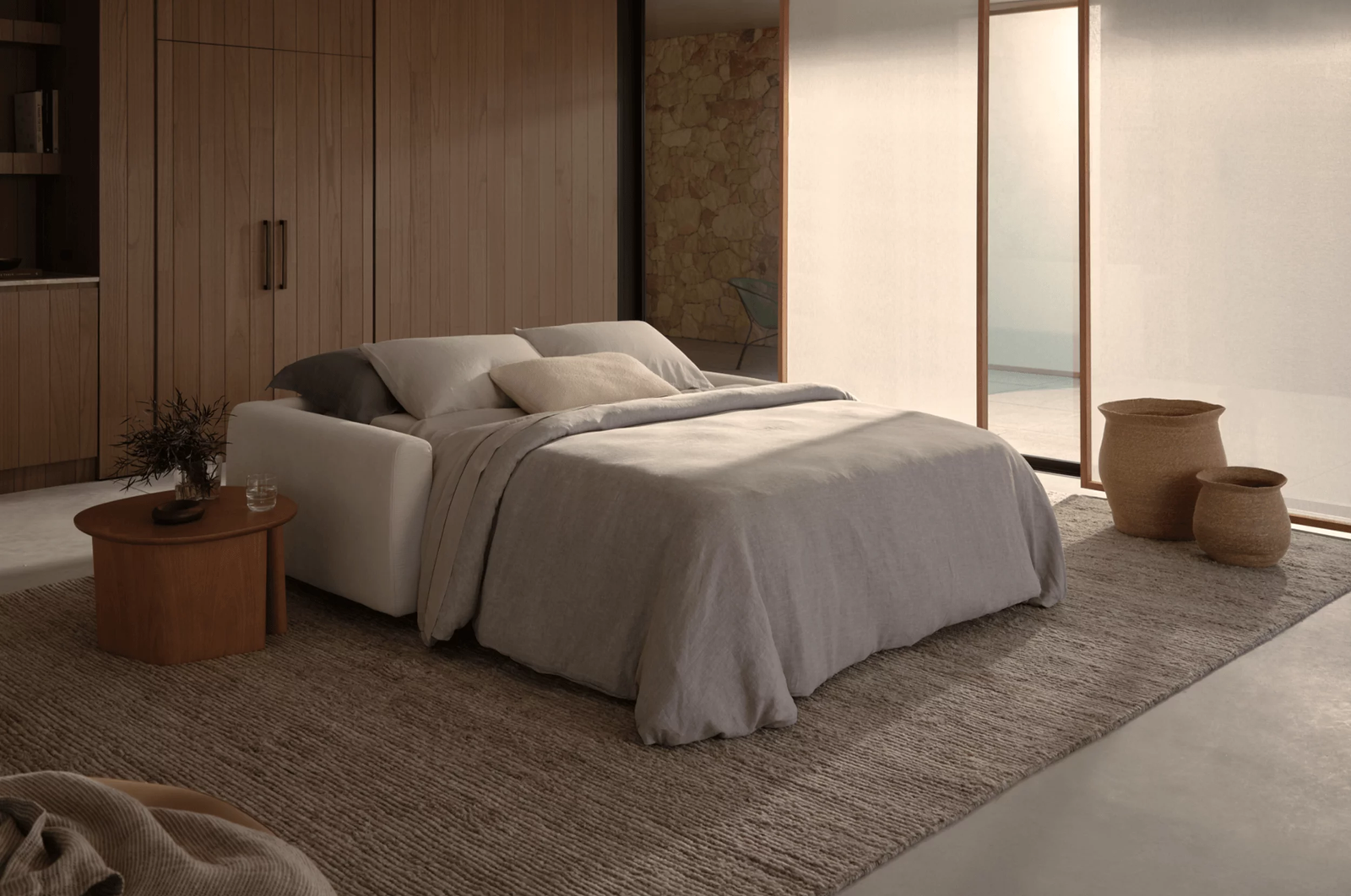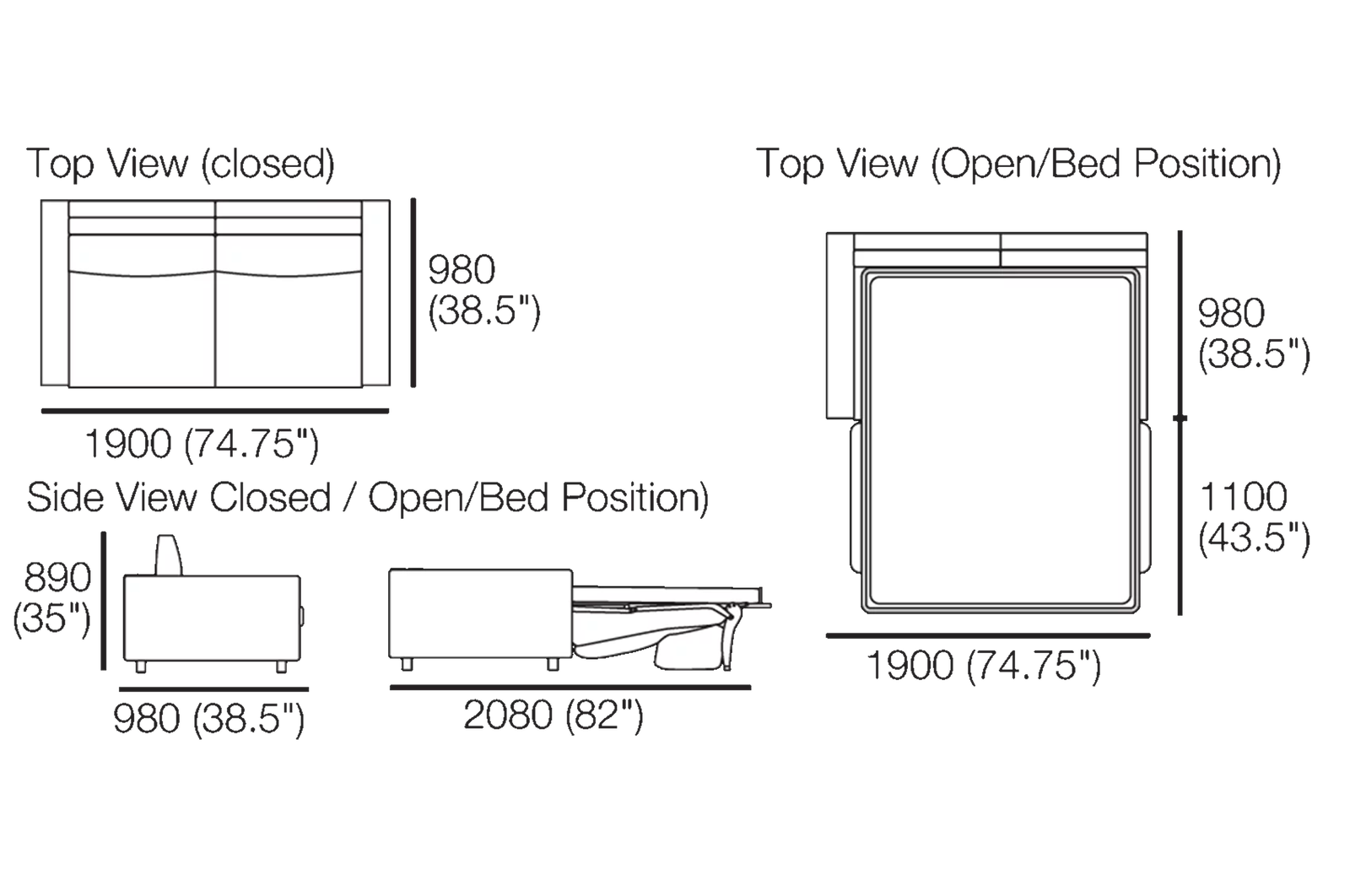 Converts from 2-seater sofa to double bed in a single motion